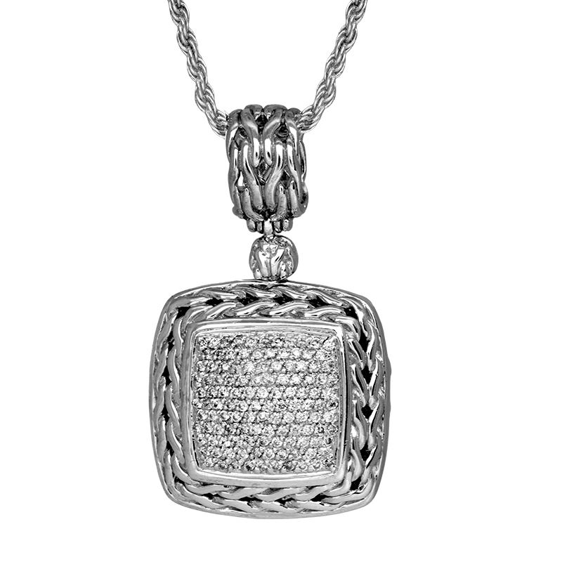 Vintage sterling silver & 18k yellow gold John Hardy Classic square pendant set with 1.00 carat of round brilliant earth-mined diamonds. Shown on an 18″ sterling silver chain for $115; other lengths and styles are available.