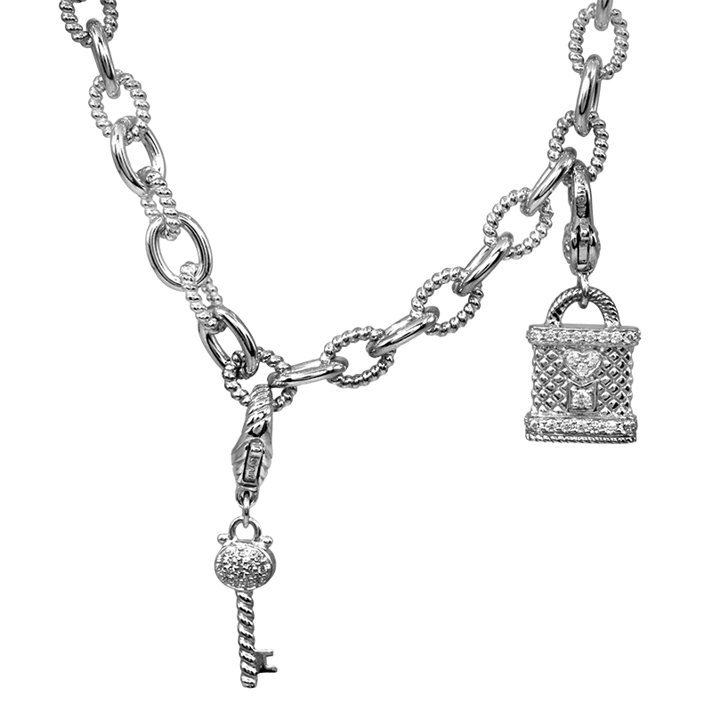 Vintage sterling silver Judith Ripka lock and key charm necklace set with cubic zirconia, 20″.