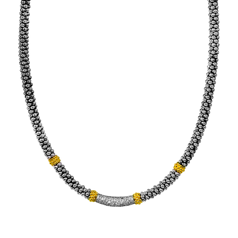 Vintage sterling silver & 18k yellow gold Lagos Caviar necklace set with 0.54 carats of round brilliant earth-mined diamonds on a 16″ chain.