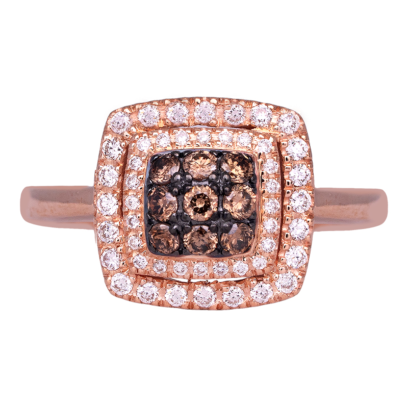 Vintage 14k rose gold LeVian cluster cushion halo ring set with 0.60 carats of brown round brilliant diamonds.