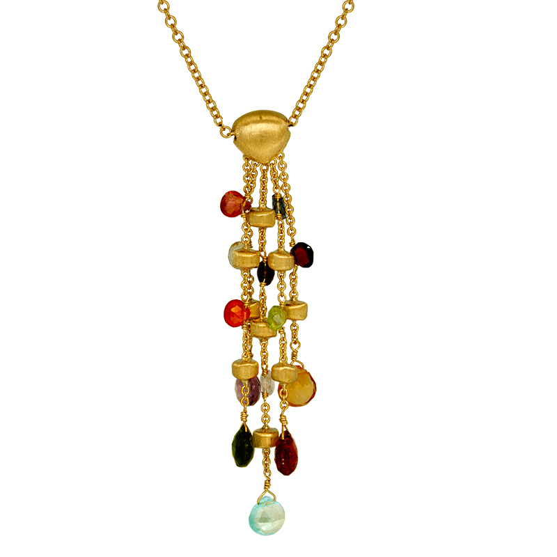 Vintage 18k yellow gold Marco Bicego Paradise drop necklace set with a variety of colored gemstones on a 16″ chain.