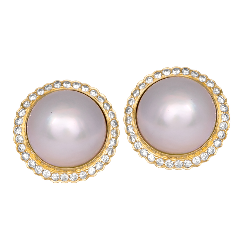 Vintage 18k yellow gold halo earrings set with 16mm mabe pearls surrounded by 1.60 carats of round brilliant diamonds.