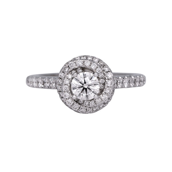 Vintage 14k white gold Vera Wang engagement ring centered with a 0.45 carat round brilliant diamond surrounded by 0.65 carats of round brilliant diamonds in the swirl halo & bands.
